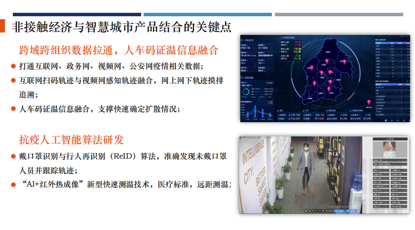 ng28南宫科技智慧城市业务群产品经理袁名人分享了“非接触经济跟智慧城市新产品结合”的案例。“非接触型经济”已然崛起,其中的技术代表在对抗疫情过程中,发挥着重要的作用。数据采集,如测温、人脸等,加之与视频、地图等方面的融合,将在各个场景中达到非接触效果的最大化。而这些数字化、智能化的沉淀,正在以”非接触“的形式惠及更多的行业与社会公共事务。