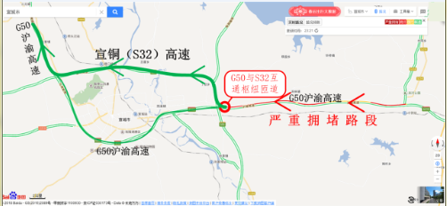 拥堵的源头位于安徽省宣城市G50沪渝高速与S32宣铜高速的互通枢纽匝道口处。往芜湖、合肥方向的大部分车辆选择在此离开G50高速,取道只有一条车道的匝道前往S32高速,继续前行23公里后,再次回到G50高速继续北上芜湖、合肥。其实,直行G50与绕行S32均能到达目的地。